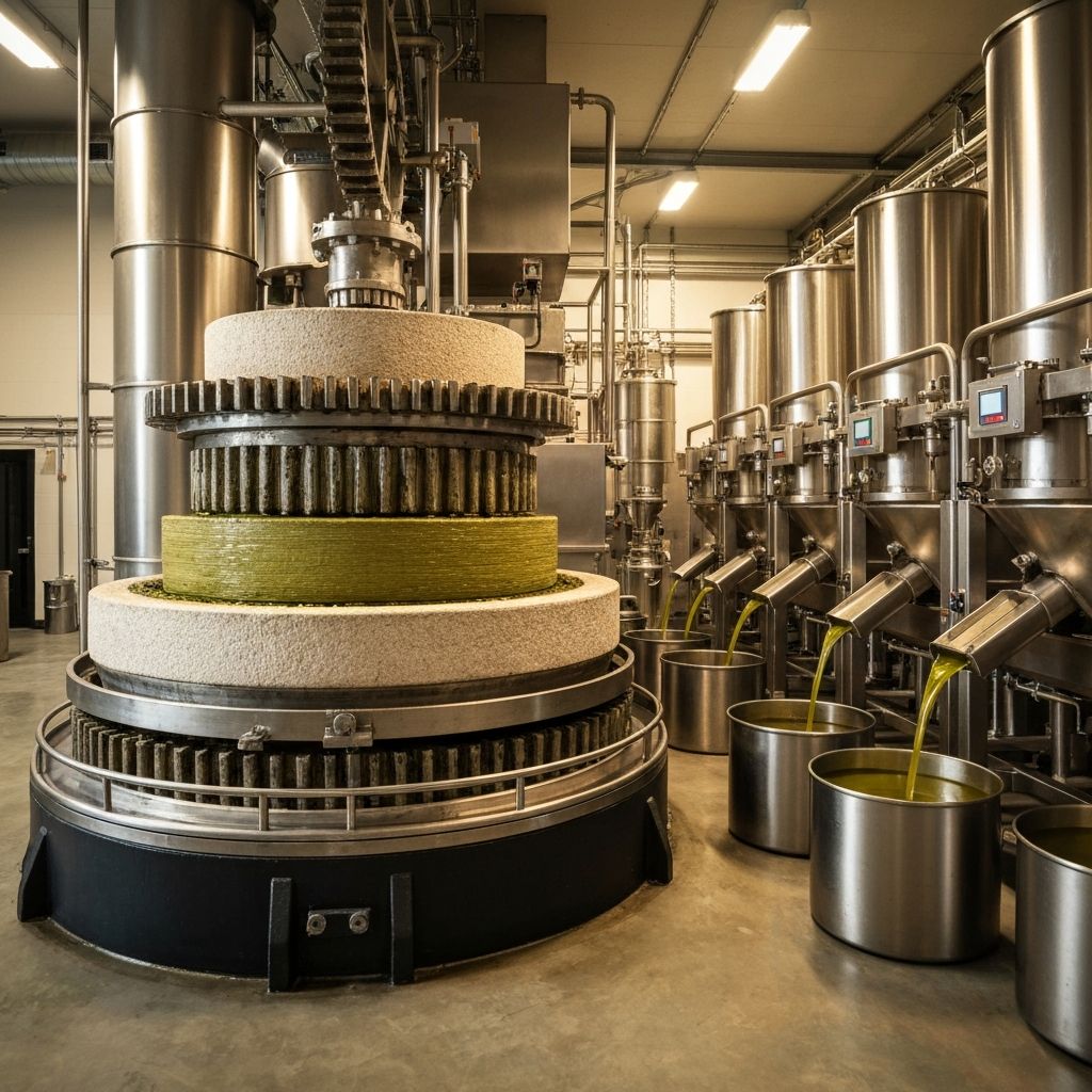 Olives are crushed into a paste using traditional stone mills, breaking down the flesh to release the oil.